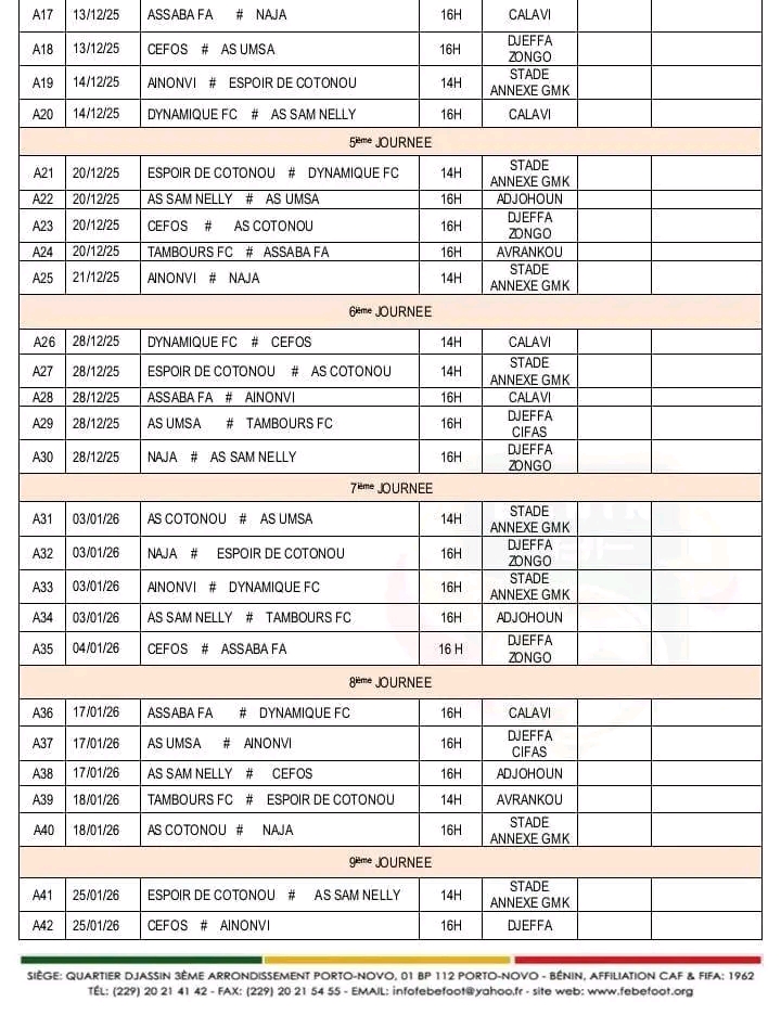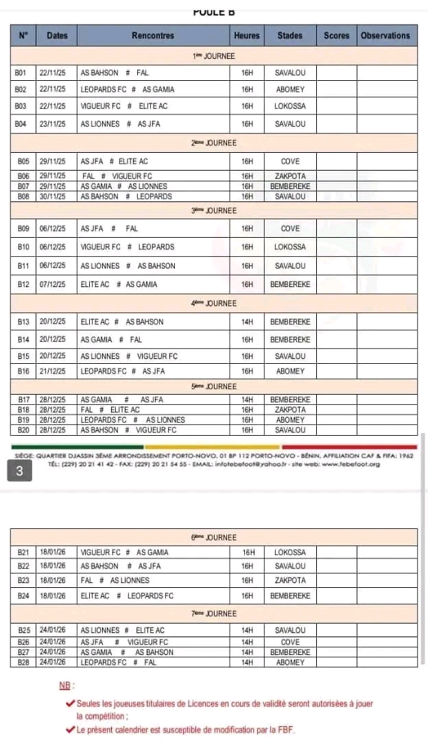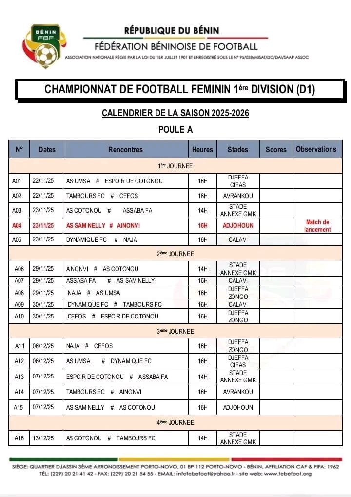 Comme annoncé, le championnat féminin reprend effectivement le 22 novembre 2025. À cet effet, le voile a été levé sur le calendrier officiel de la première division. Pour cette saison 2025-26, 18 équipes réparties en deux groupes de 10 et 08 seront à la course vers le titre. C’est à Adjohoun, au tour du duel As Sam Nely vs Aïnovi qu’aura lieu le match de lancement.