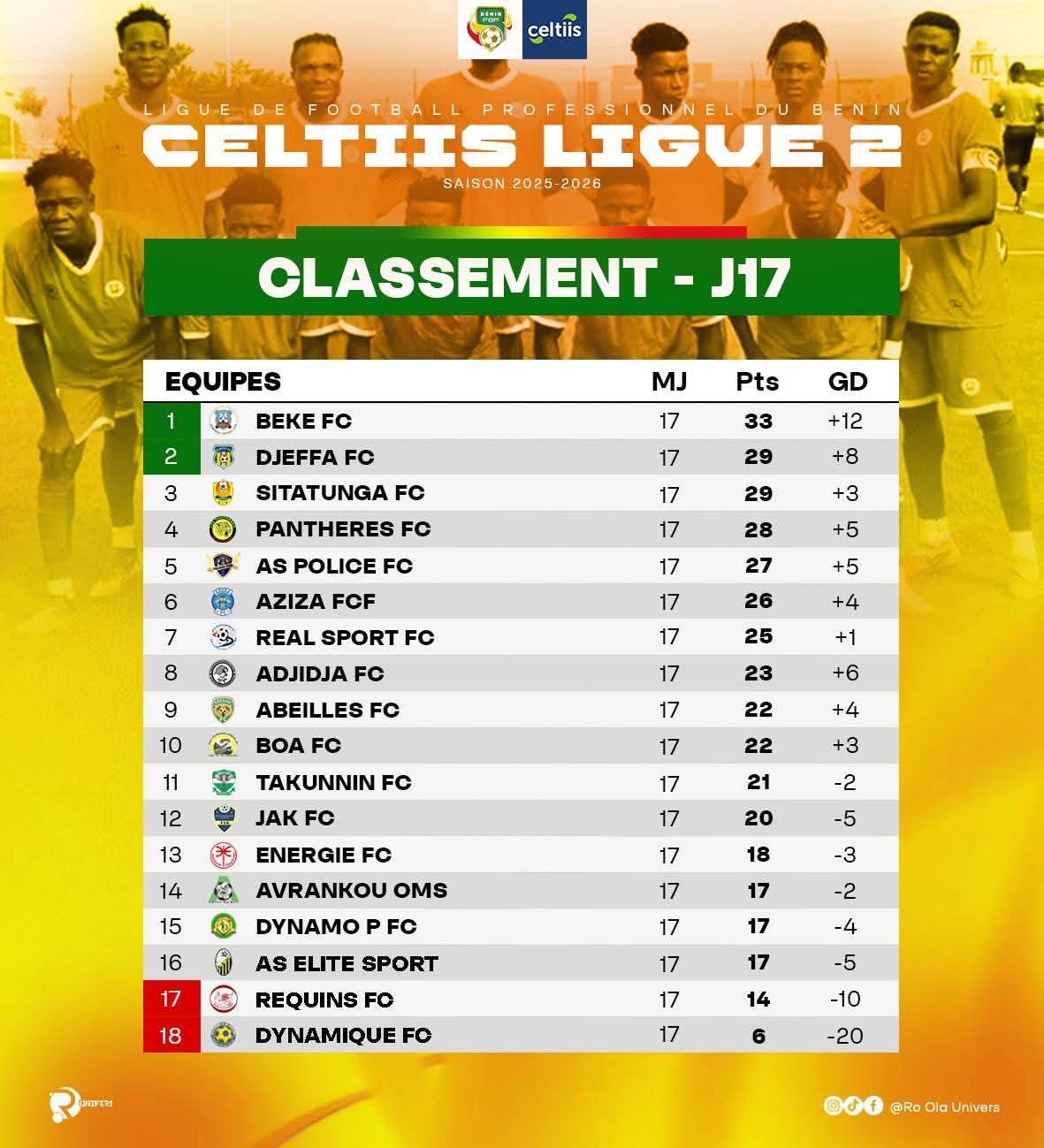Portée par les performances solides de Béké FC, Djeffa FC et Sitatunga FC, la phase aller de la Celtiis Ligue 2 s’est refermée au terme d’une 17ᵉ journée riche en enseignements. Leader au classement avec 33 points et une défense quasi imprenable, Béké FC a conclu cette première partie de saison par un succès précieux sur la pelouse d’Abeilles FC (1-0), confirmant sa régularité. Derrière, Djeffa FC, auteur d’une victoire spectaculaire face à Takunnin FC (4-2), s’affirme comme l’équipe la plus prolifique du championnat et s’installe solidement sur le podium. À égalité de points avec Djeffa FC, Sitatunga FC a également soigné sa copie en dominant Jak FC (1-0), consolidant ainsi sa place parmi les prétendants sérieux à la montée