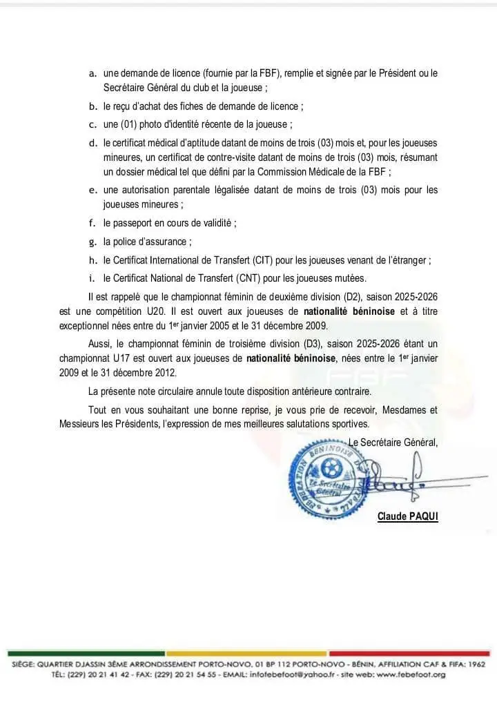 À travers une note circulaire en date du mardi 28 octobre 2025, la Fédération béninoise de football, par l’entremise de son secrétaire général Claude Paqui, a annoncé le début des championnats féminins. La note a également abordé la question des effectifs attendus ainsi que les exigences de licence.