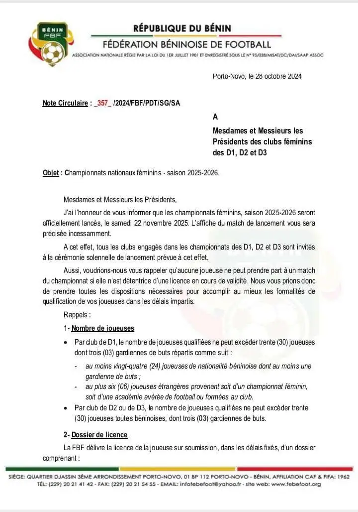 À travers une note circulaire en date du mardi 28 octobre 2025, la Fédération béninoise de football, par l’entremise de son secrétaire général Claude Paqui, a annoncé le début des championnats féminins. La note a également abordé la question des effectifs attendus ainsi que les exigences de licence.