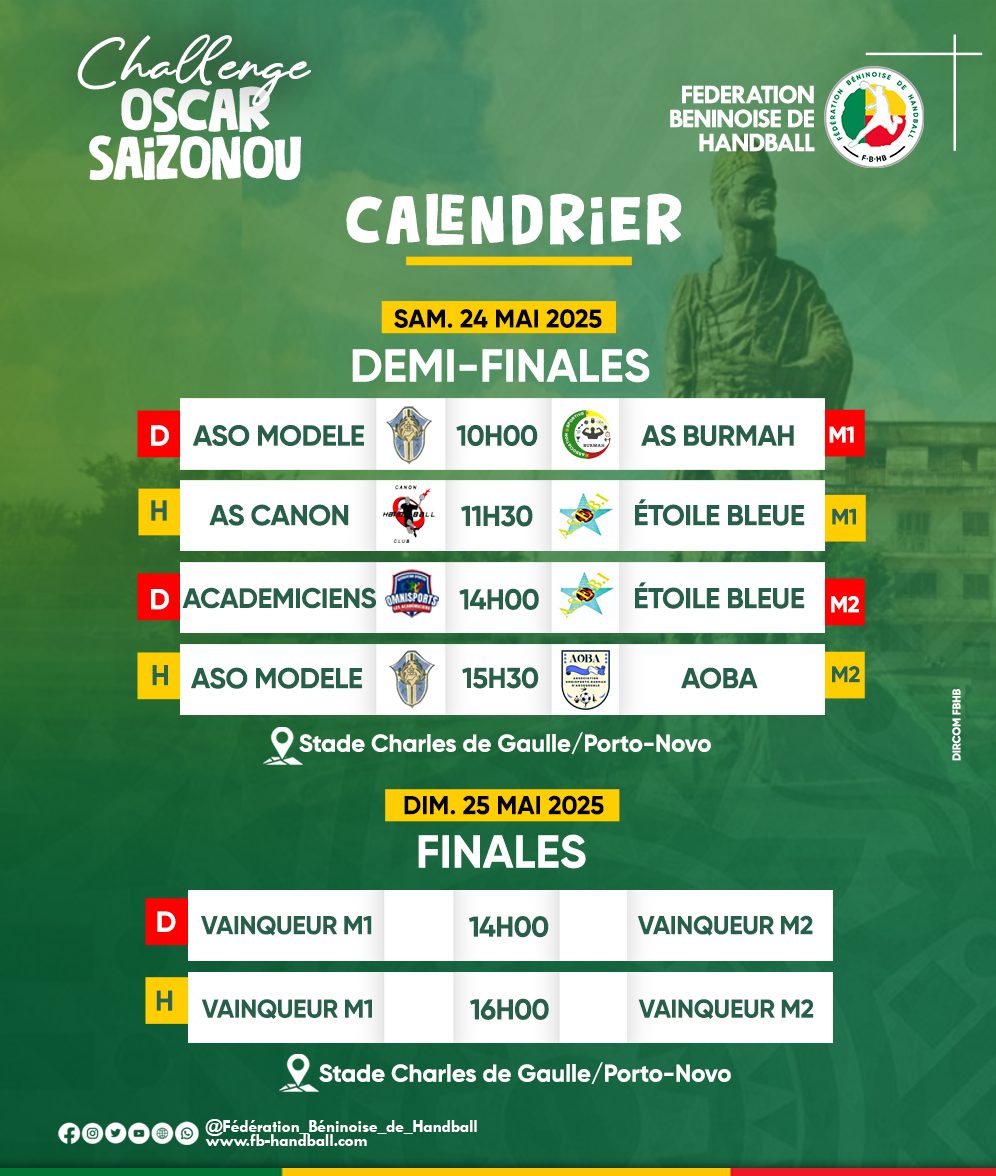 Les 24 et 25 mai 2025 le Challenge Oscar Saïzonou aura lieu à Porto-Novo. C’est une compétition qui donne le top départ de la saison de handball dans la zone Sud-Est du pays. Quatre équipes féminines et quatre équipes masculines sont engagées. Le Stade Charles de Gaulle sera le théâtre des affrontements, toujours dans un esprit de fair-play.