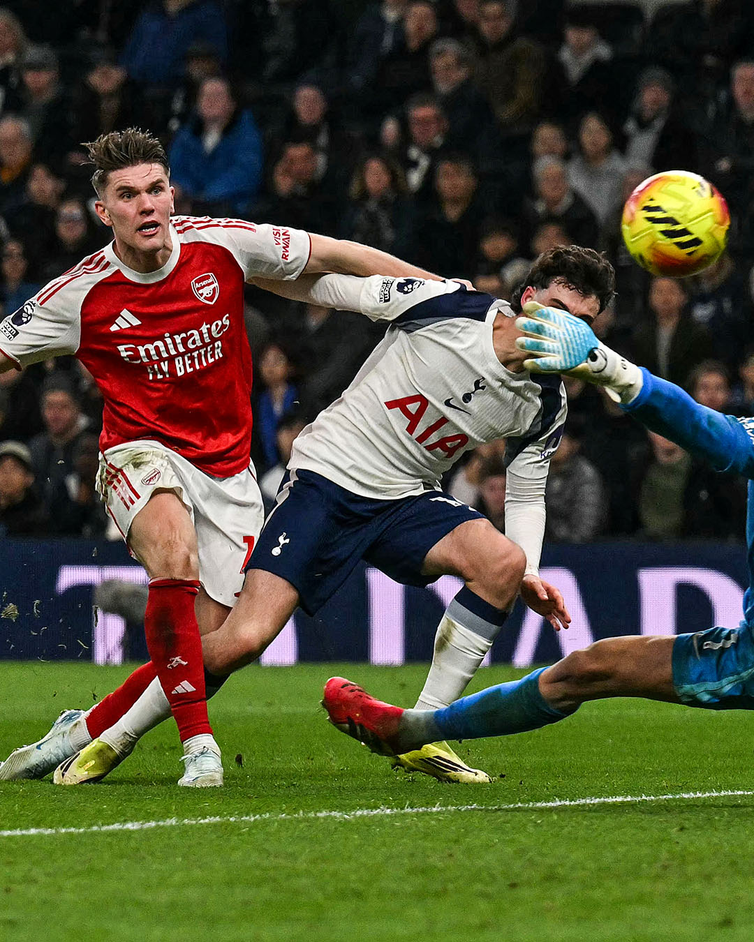 La fin de rencontre confirmait l’intensité totale du derby. Trossard manquait de peu le quatrième but sur une frappe enroulée (70ᵉ). Tottenham se procurait une énorme occasion à la 84ᵉ : centre de Djed Spence et déviation façon Madjer de Richarlison, mais David Raya se rattrapait sur sa ligne pour préserver l’avantage. L’ultime coup de grâce intervenait dans le temps additionnel : Gyökeres s’offrait un doublé avec un quatrième but (90e+4, 1-4).